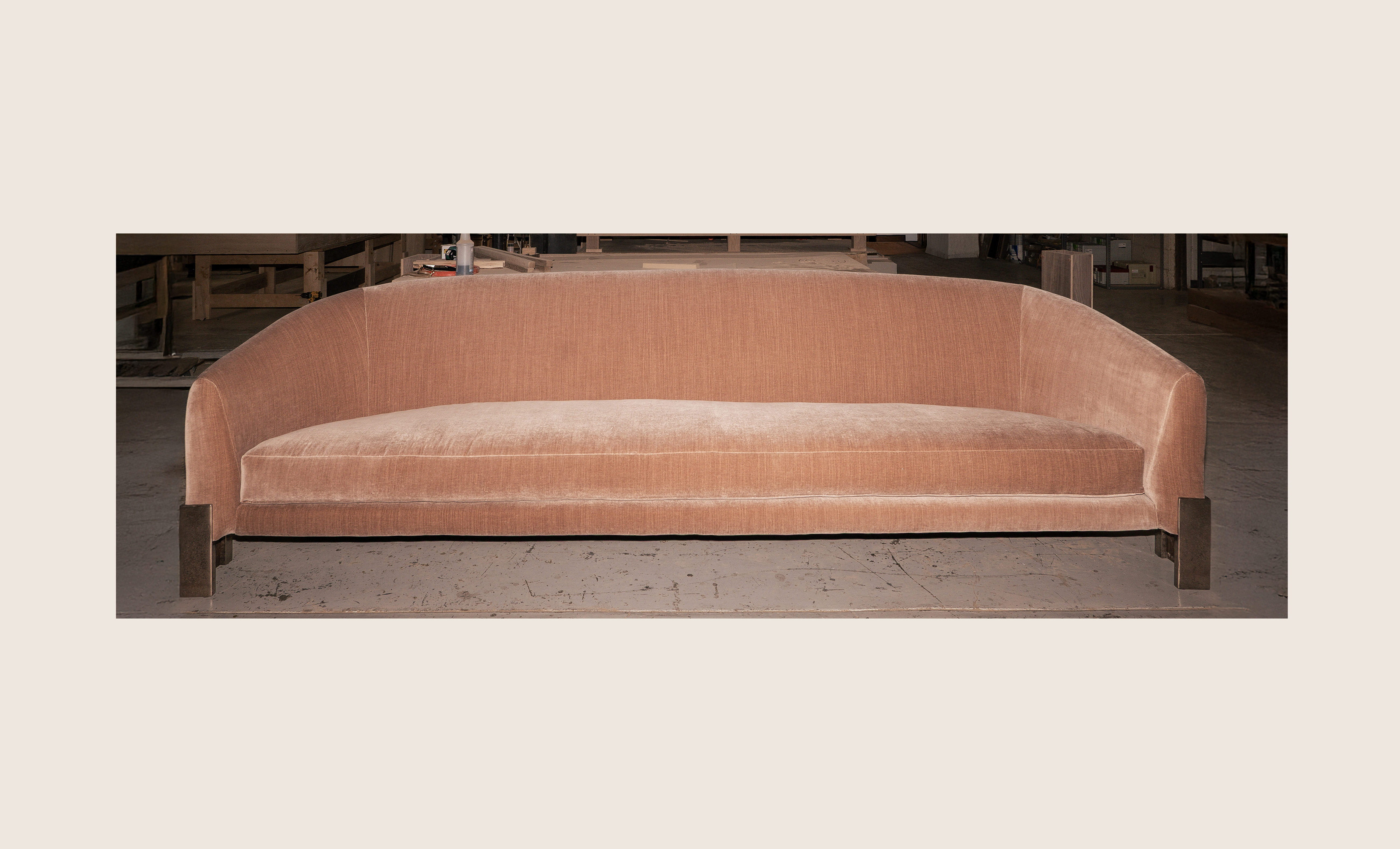A soft, continuous upholstered form lifted by cast-bronze legs that cradle it from the sides and back. The tight seat and single cushion keep the geometry clean and usable, while the bronze frame adds support and sculpture. Designed to anchor a space with comfort and material focus, without overwhelming it.