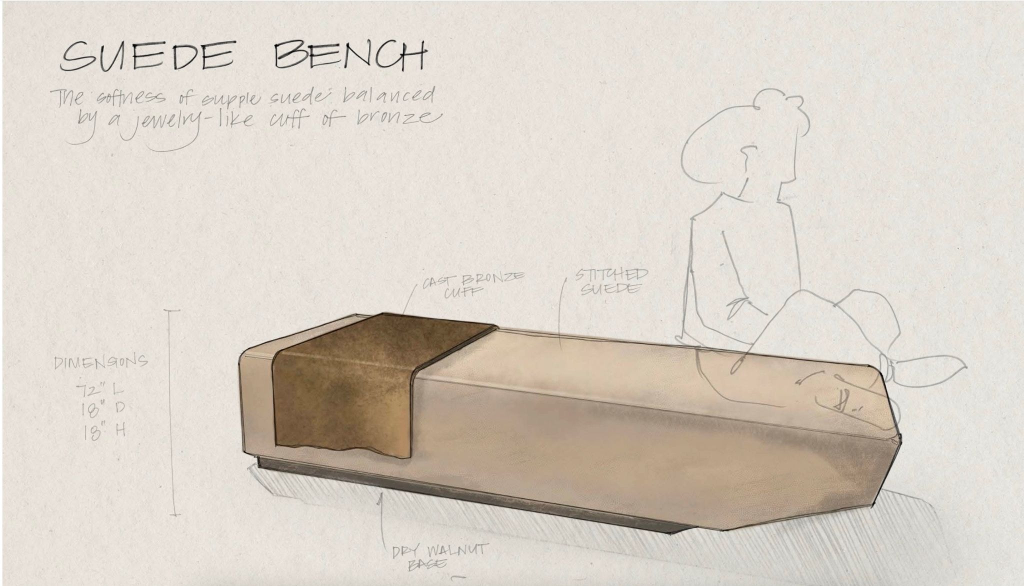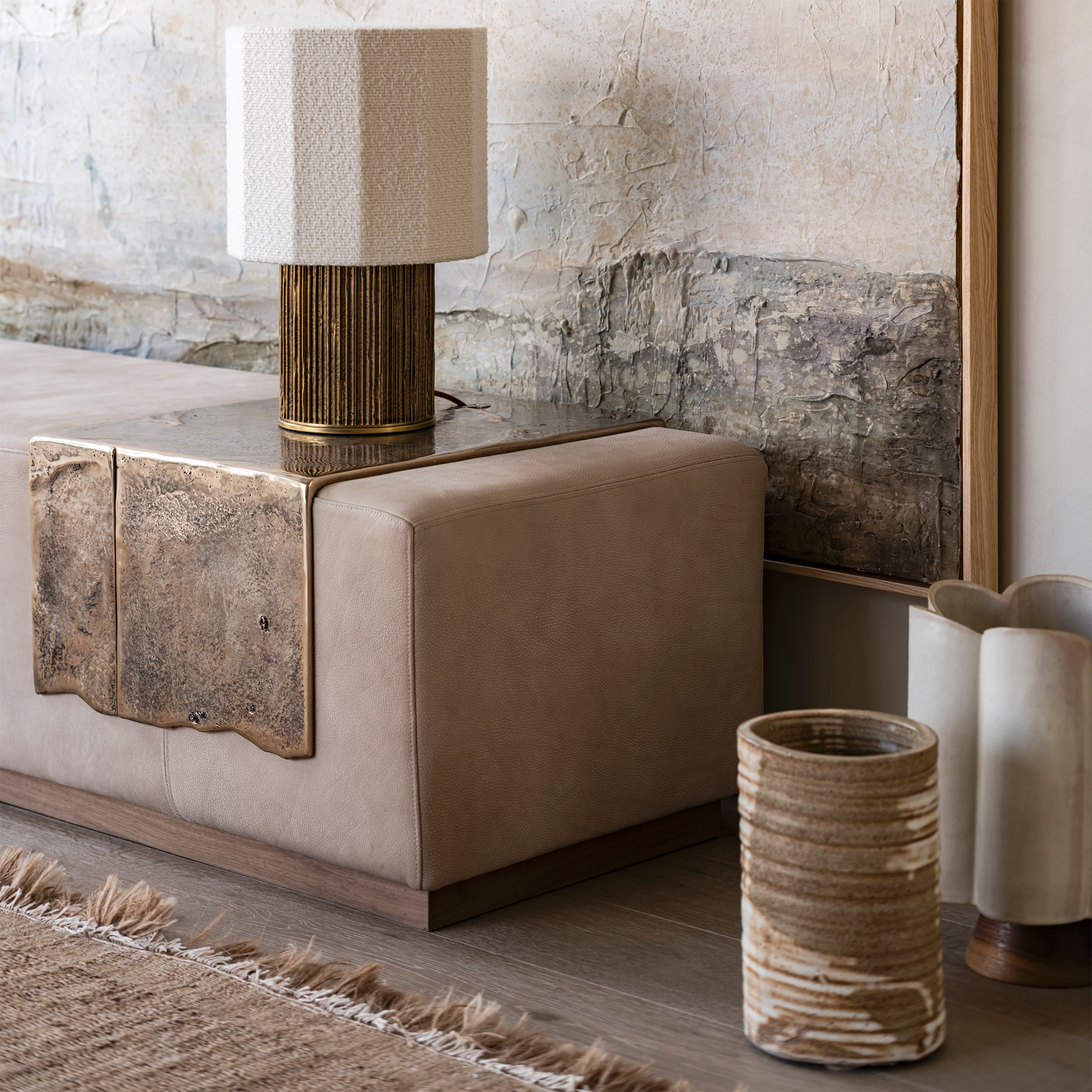 A sculptural bench that serves as both seat and surface. The cast-bronze cuff becomes a natural spot for books or lighting, giving the piece purpose beyond form. Its grounded scale works at a bed’s foot, in an entry, or floating in a room. Bronze, suede, and wood bring warmth, weight, and a quiet architectural presence.